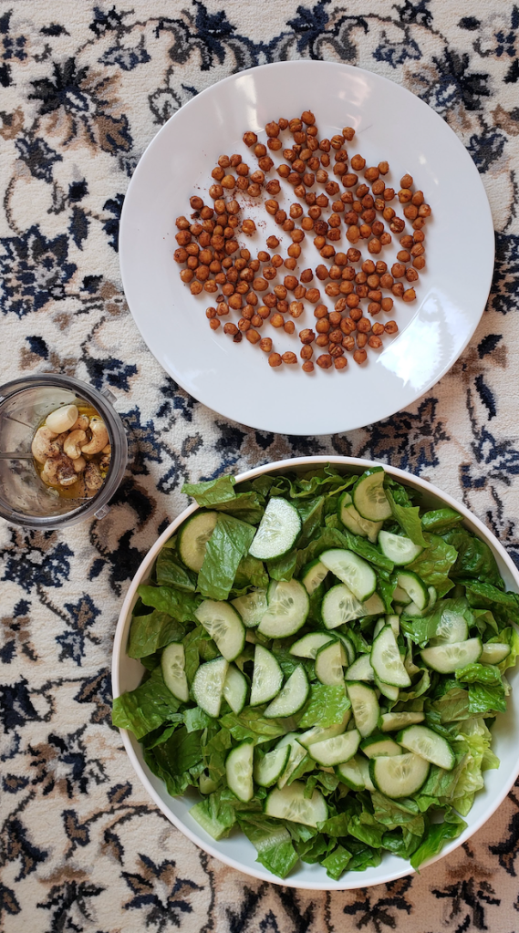 My favorites are lettuce, cucumber, tomato, red pepper and avocado. On this day I added cucumber and some chickpeas that I baked in the oven with some cumin, paprika, salt, pepper and chilli powder. Other options could be spinach, kale, left over quinoa, radish, etc.